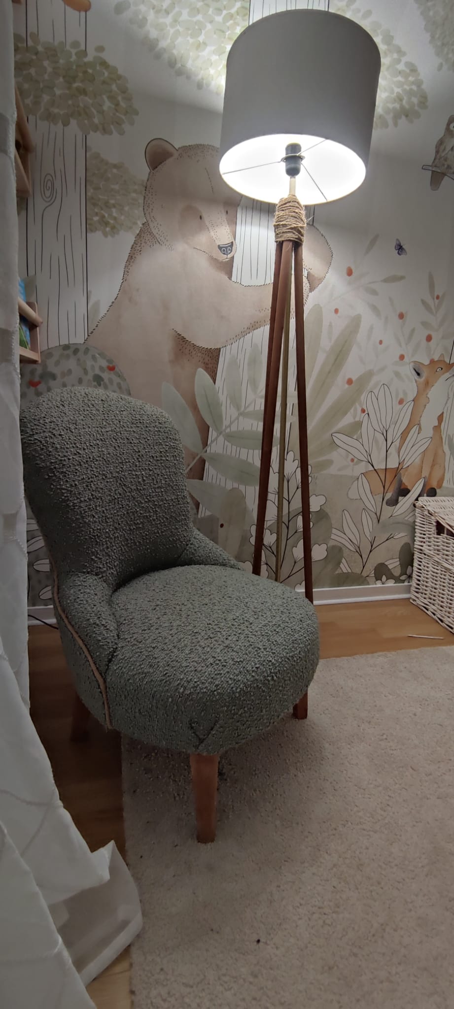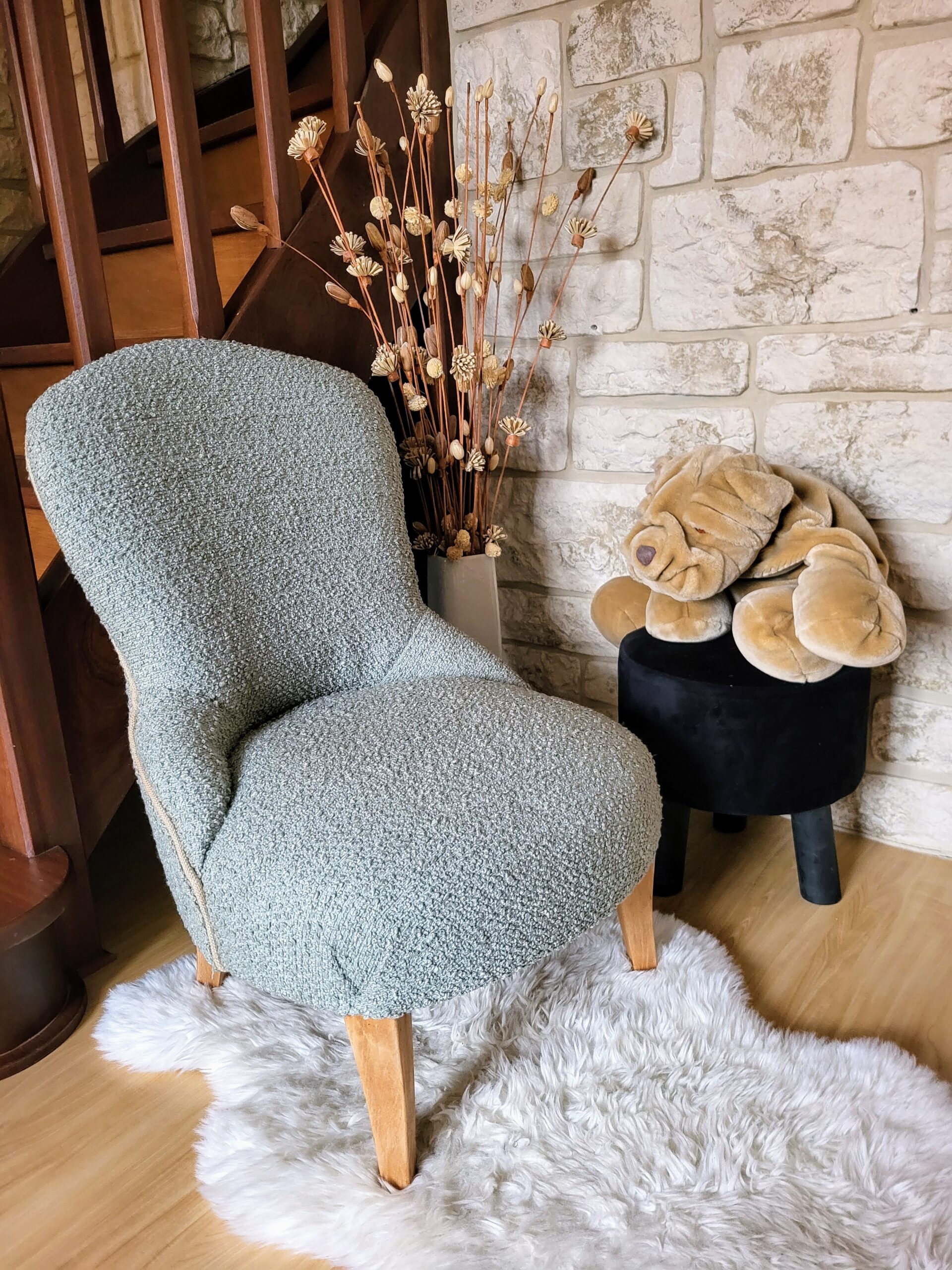 Ce fauteuil trèfle, habillé d’un tissu Casamance vert d’eau apaisant, ajoute une touche de douceur et de fraîcheur à une chambre d’enfant, alliant confort et esthétique