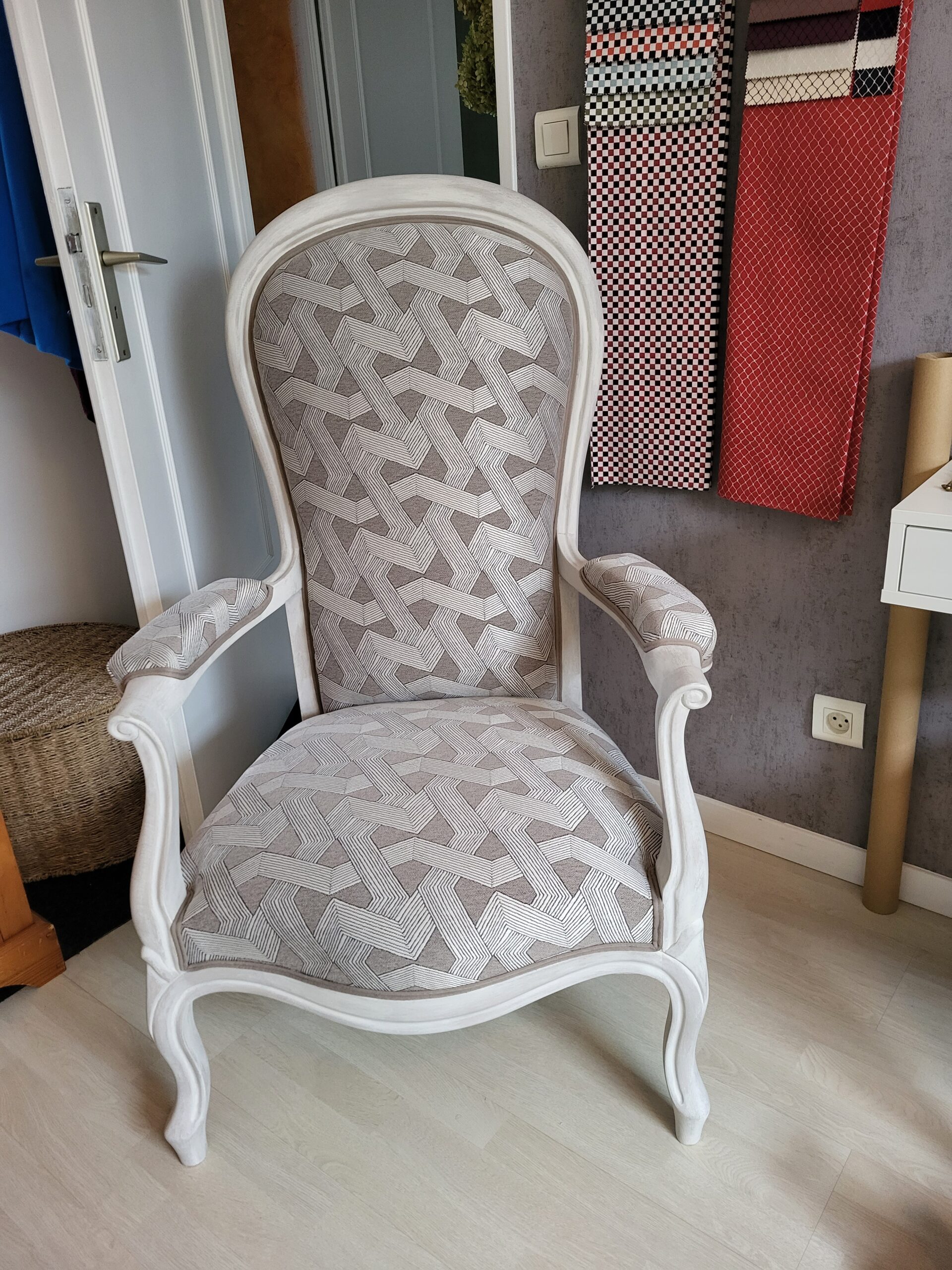 Ce fauteuil Voltaire a été sublimé par un changement de tissu, apportant une touche de fraîcheur tout en conservant son élégance intemporelle. Confort et raffinement assurés !